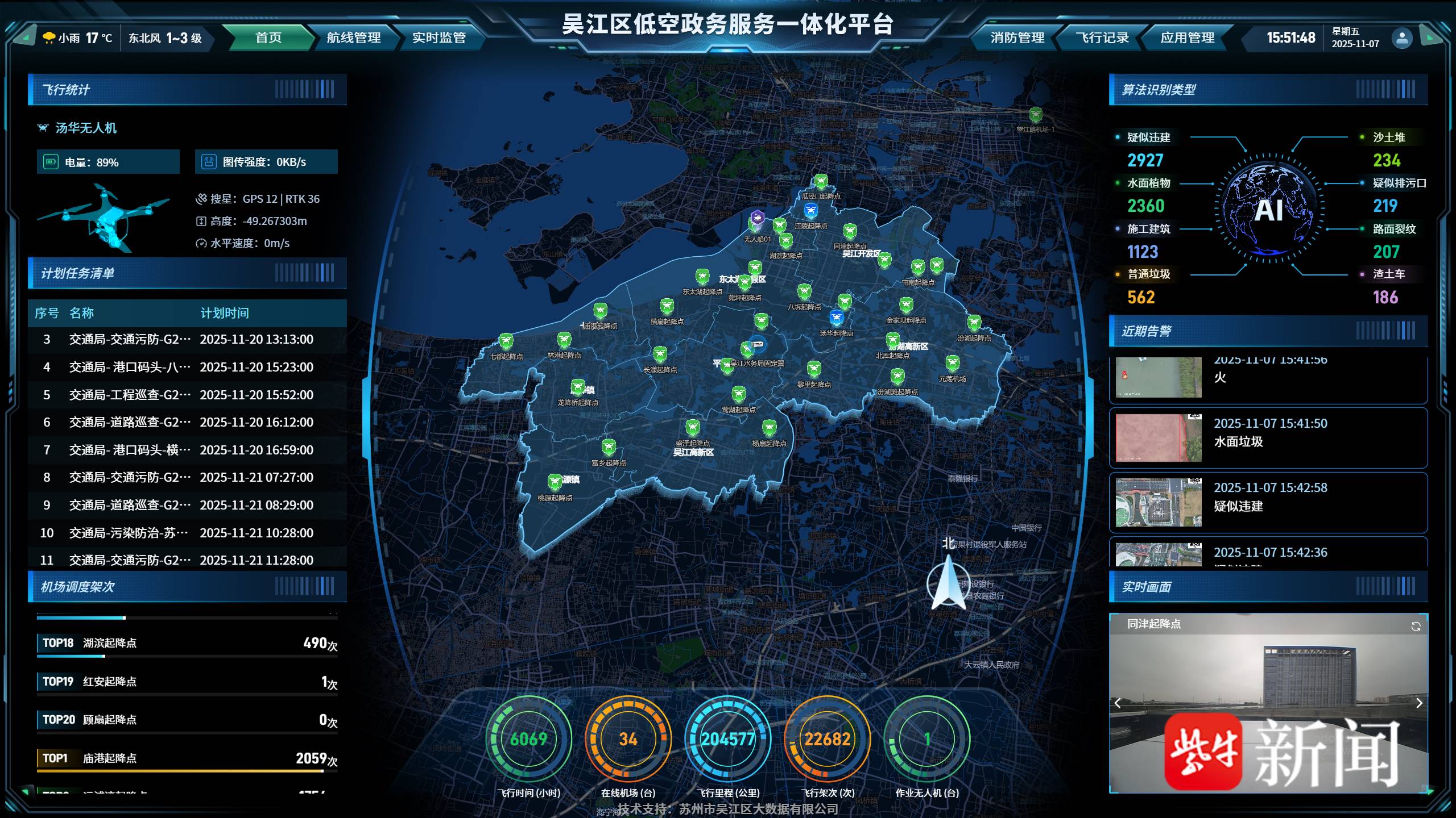 2024年,吴江率先建成的全市首个交通工程无人机机场自动巡飞系统,实现了对工地“一带一帽”、扬尘治理、临边防护等关键场景的AI算法智能识别与全天候监控。升级后的系统推动了交通监管从单一工地管理向港口码头、航道巡查、渣土运输路线及非法倾倒点位的全域覆盖转变,全区交通领域污染防治监管及交通工程安全、质量监督实现从“人工排查”到“AI识别”、从“地面巡查”到“空中监管”的跨越式升级,构建起水陆空三位一体的现代化治理新格局。