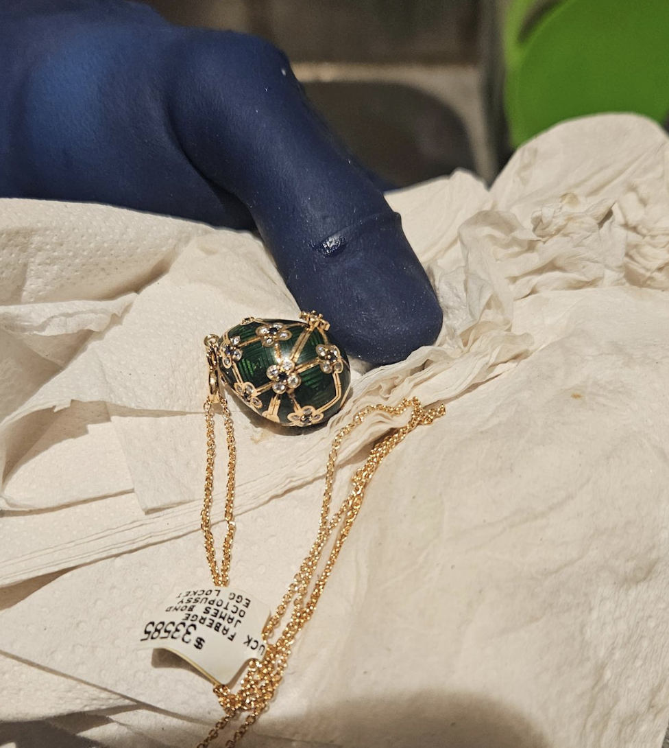 据此前报道,被吞的是一枚名为“八爪女”的法贝热彩蛋吊坠。根据珠宝商的官网描述,这款珠宝镶嵌了60颗白钻和15颗蓝宝石,打开彩蛋,里面还藏着一只18K金的迷你章鱼。这枚吊坠价值高达33,585新西兰元(约合人民币13.6万元)。