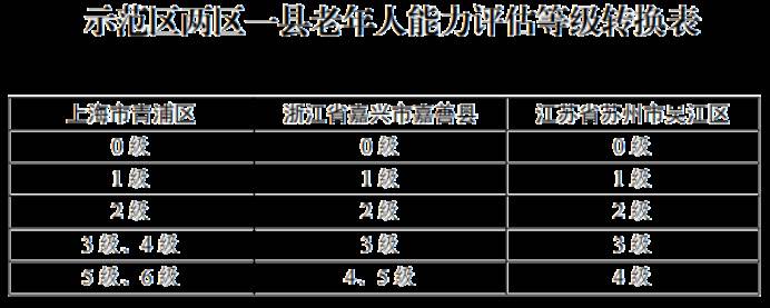 针对部分老人缺少能力等级评估结果的情况,实施方案也给出了解决方案:由户籍地民政部门依据《示范区老年人能力评估等级转换表》确认补贴额度,省去老人重复评估的麻烦。