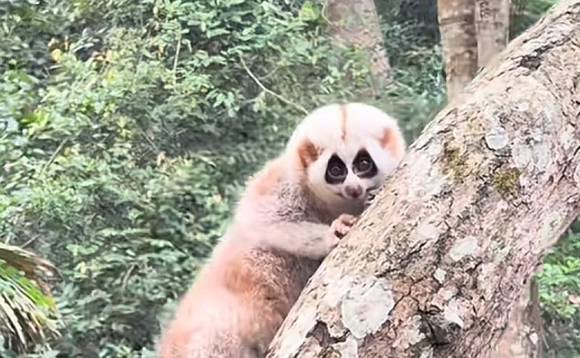网上公开资料可知,蜂猴是国家一级重点保护野生动物。俗名风生兽、懒猴等等,生活在海拔1000米以下的亚洲东部雨林区,国内分布于云南、广西。蜂猴是夜行性动物,畏光怕热,因此白天它们蜷缩于茂密的树枝上睡觉。此外,蜂猴也是灵长目中罕见的毒猴,受到惊吓时,它们会把手臂举起来,因为其毒腺位于手肘部,毒液可从手肘内侧分泌出去。