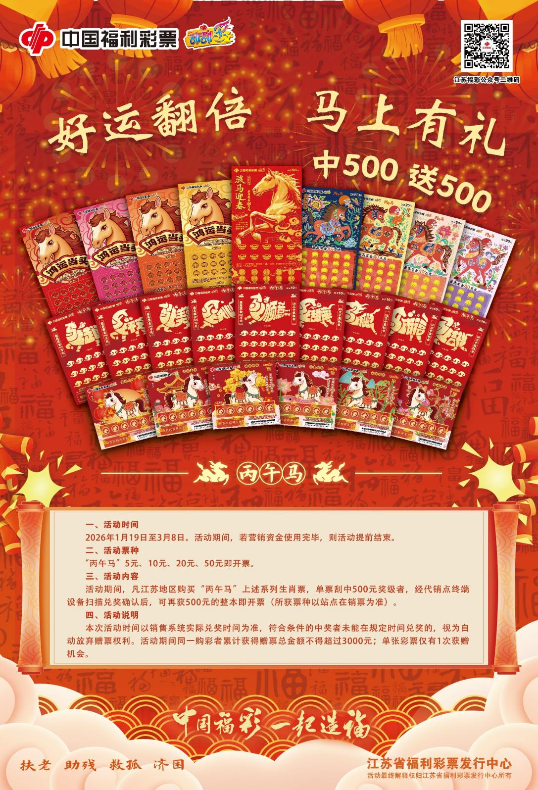 2026年1月19日至3月8日,活动期间,凡在江苏地区购买“丙午马”系列即开票,单票刮中500元奖级的幸运购彩者,经代销点终端设备扫描兑奖确认后,可额外获赠500元整本即开票,双重惊喜助力新春行大运。