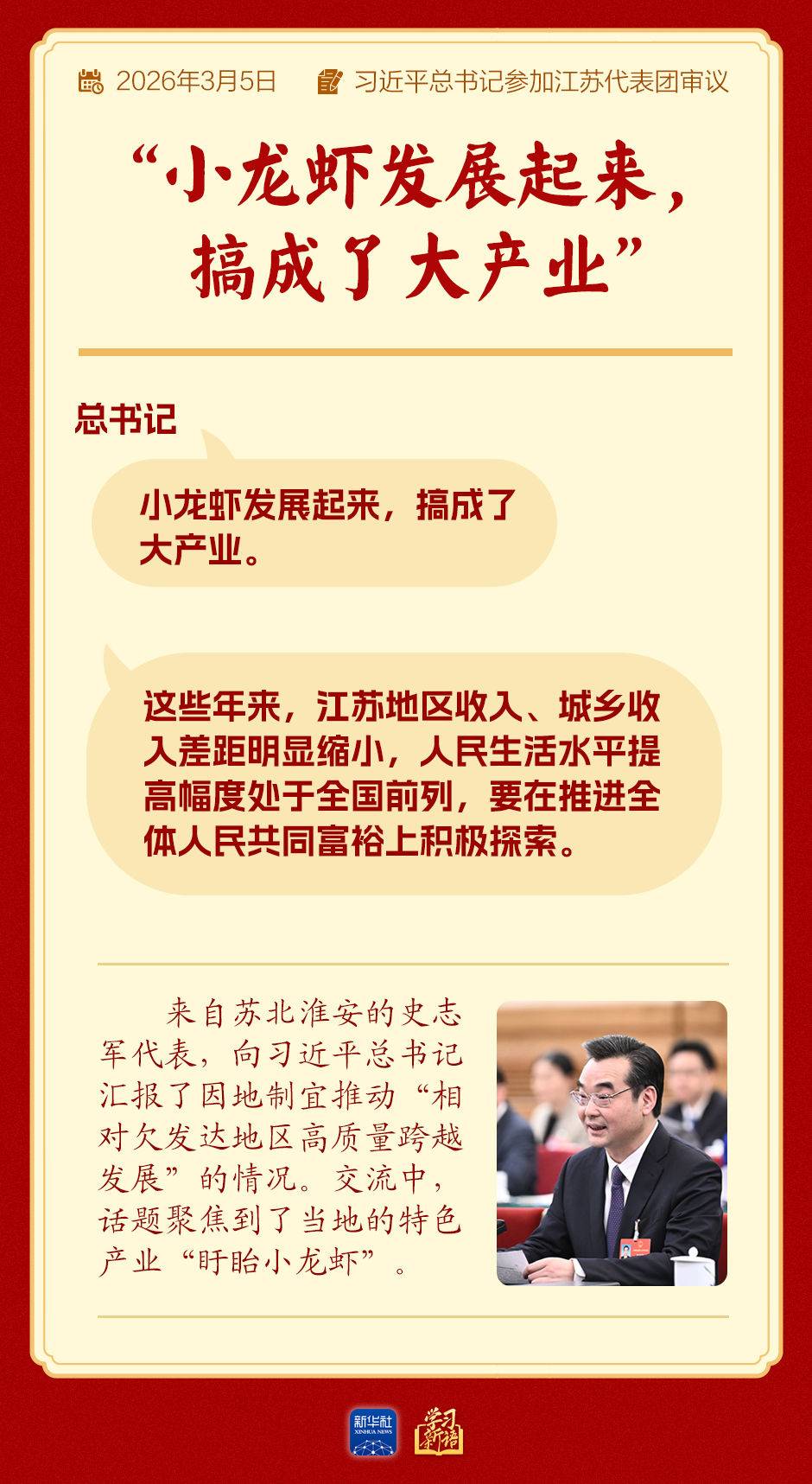 “小龙虾发展起来,搞成了大产业。”总书记笑着说。