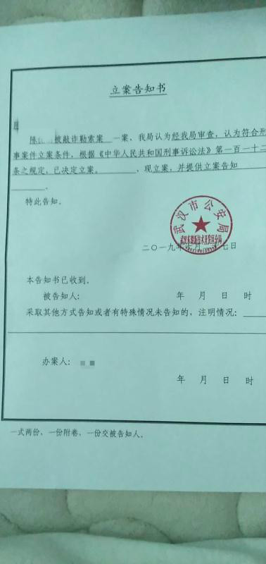 陈优丽提供的一份该局《立案告知书》显示,陈优丽被敲诈勒索一案,该局认为符合立案条件,根据《中华人民共和国刑事诉讼法》相关法条之规定,决定立案。