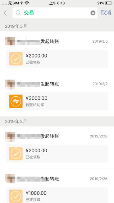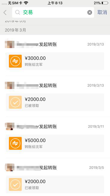 2019年2月26日,她向沈军转账1000元;2月28日转账2000元;3月2日转账3000元;3月5日转账2000元……