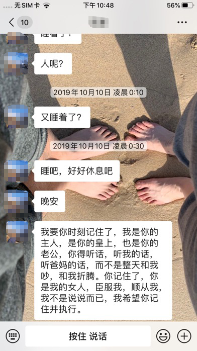 2019年10月10日凌晨的一张微信聊天截图显示了沈军对陈优丽施加的精神压力。