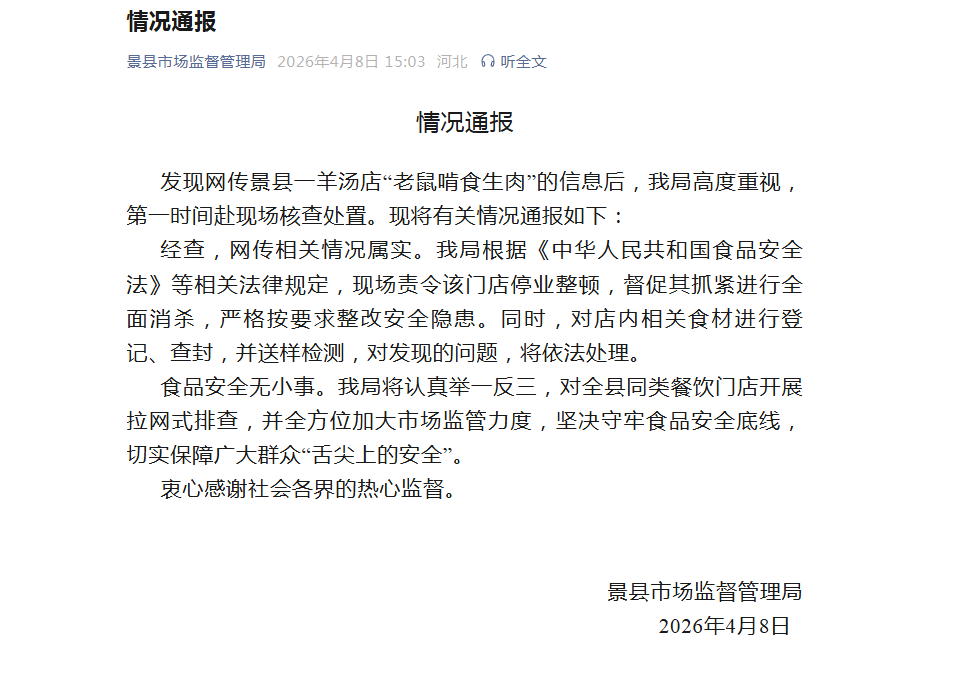 今天下午,景县市场监督管理局针对该起事件发布了情况通报。通报称,发现网传景县一羊汤店“老鼠啃食生肉”的信息后,该局高度重视,第一时间赴现场核查处置。现将有关情况通报如下:经查,网传相关情况属实。我局根据《中华人民共和国食品安全法》等相关法律规定,现场责令该门店停业整顿,督促其抓紧进行全面消杀,严格按要求整改安全隐患。同时,对店内相关食材进行登记、查封,并送样检测,对发现的问题,将依法处理。