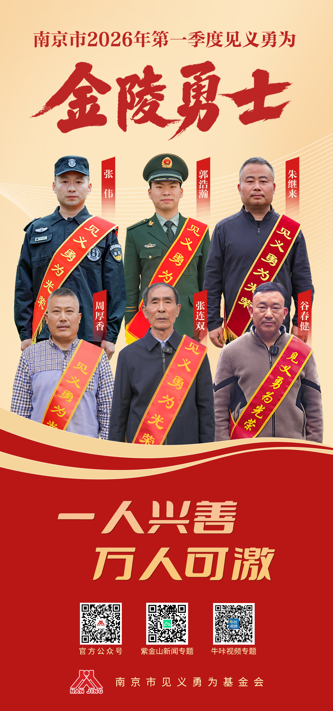 4月9日,南京市2026年第一季度见义勇为“金陵勇士”发布,6名见义勇为人员光荣上榜。