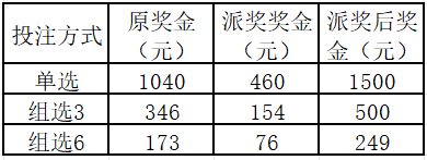 其中单选玩法单期派奖总金额封顶240万元,若当期派奖总金额超过240万元,则按当期符合条件的中奖注数均分240万元,均分后单注派奖金额以元向下取整;组选3和组选6玩法单期派奖总金额封顶150万元,若当期派奖总金额超过150万元,则按当期符合条件的中奖注数均分150万元,均分后单注派奖金额以元向下取整。