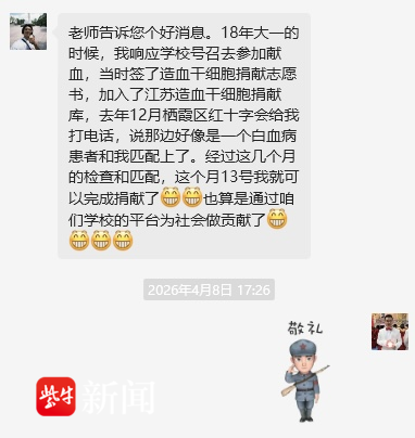 2025年12月,栖霞区红十字会告知梁照鼎与一名白血病患者配型成功。得知消息后,这位毕业四年的校友毫不犹豫同意捐献,并全程配合完成高分辨配型与全面体检。在与原班级辅导员郑贵宝老师的对话中,他谈及捐献的初心,作为一名医学院学生、一名预备党员,救死扶伤、帮助他人是自己义不容辞的责任;更感恩国家“对口援疆”政策,让自己有机会进入南京中医药大学学习,在母校的培养下成长为有担当的青年,也希望借此机会感恩母校、回馈社会,为公益事业贡献力量。
