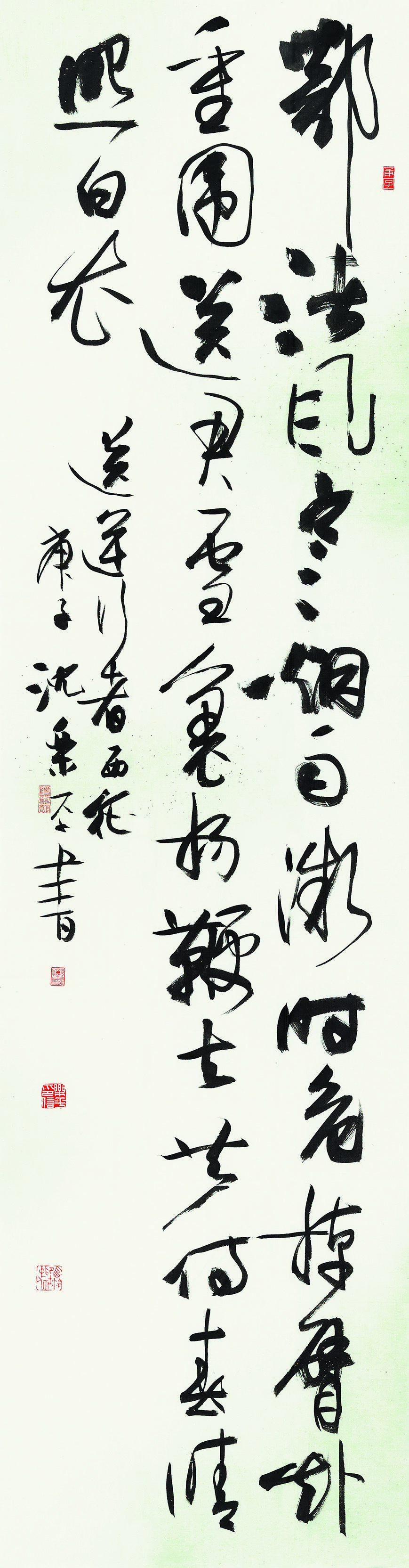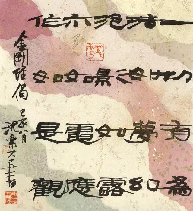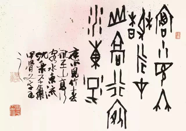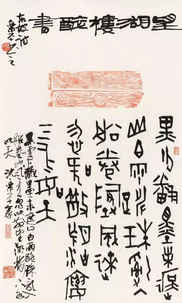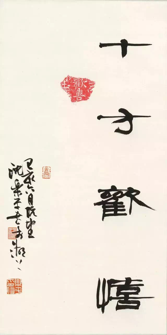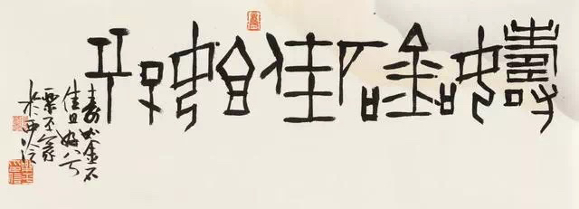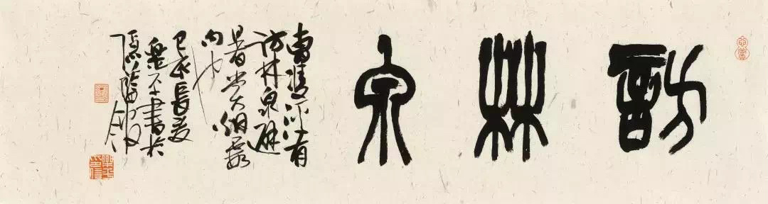 沈乐平的作品,书体之间多有互相渗透、互相兼容,使灵动的行草中兼有篆隶的厚重、凝练、质朴,而古拙的篆隶中又表现出行草书的轻松、婉转、流畅的笔意,这或许便是他在研究书史之余,对书法的最大体悟,进而运用于创作之中。