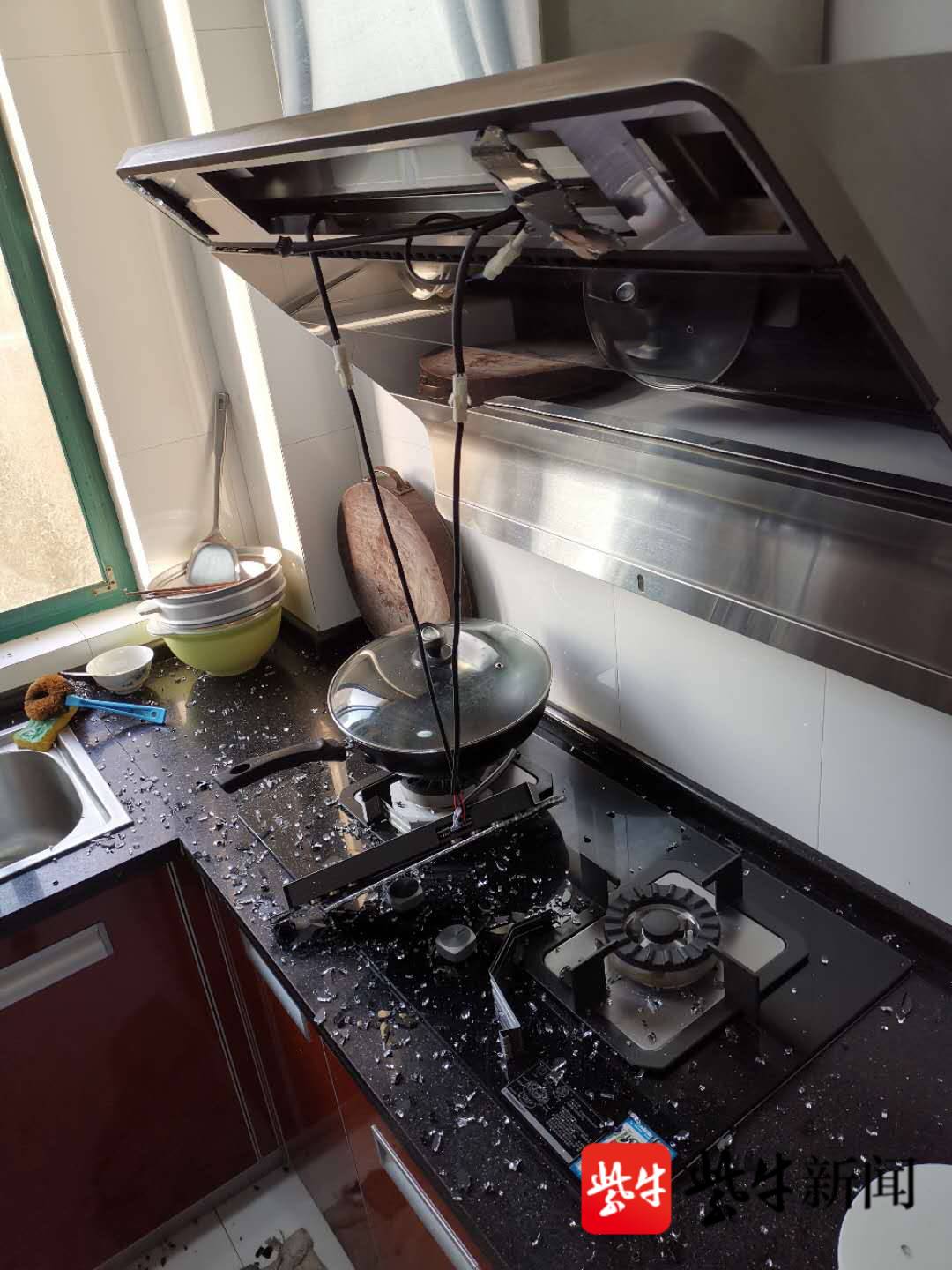通过史女士提供的现场照片,记者看到,油烟机上原本应该是一块完整的电脑显示屏玻璃面板挂到了灶台上,灶台上和厨房的地面上满是黑色的玻璃碎碴。