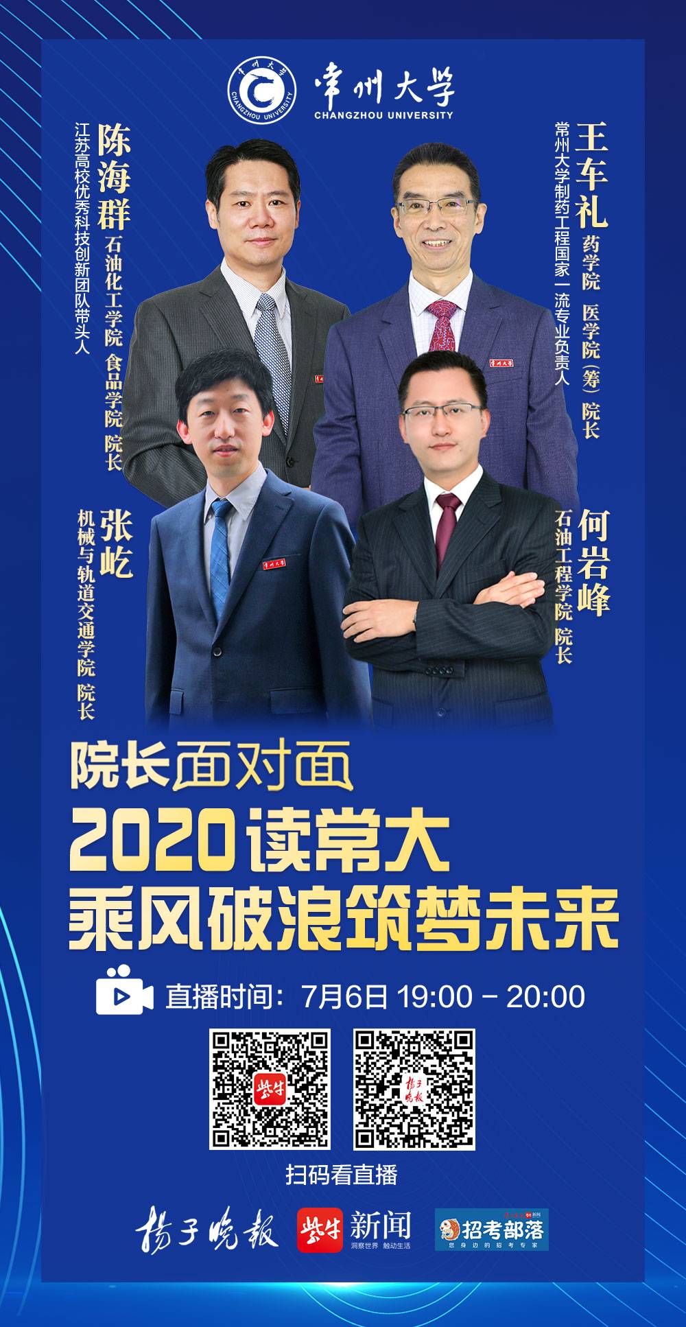 “院长面对面,2020筑梦常大”系列直播共分四期,7月6日、7月10日、7月14日、7月17日19点—20点,扬子晚报紫牛新闻直播平台、扬子晚报一直播平台将同步直播。常州大学16位院长将陆续亮相为你全方位介绍常州大学,考生和家长可扫描二维码,即可随时关注,到点收看直播啦。