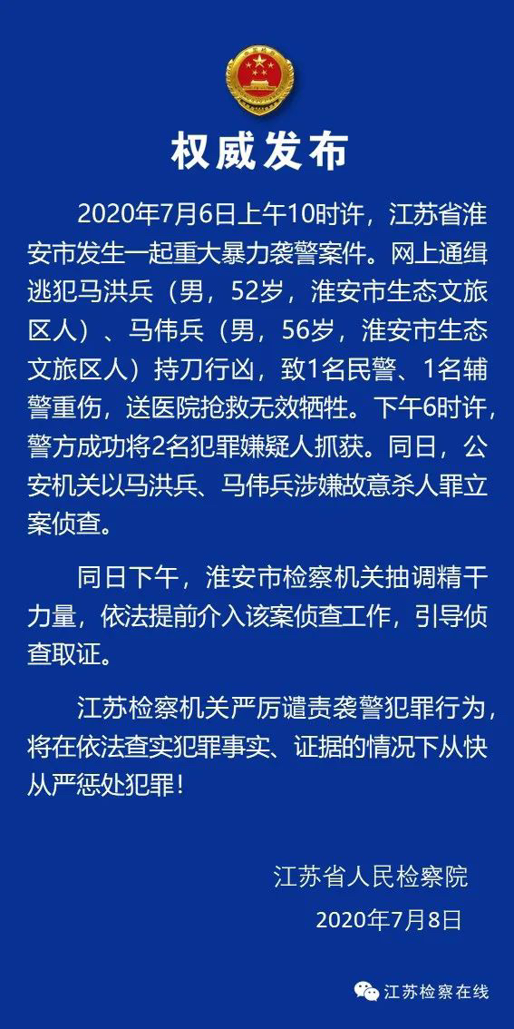 2020年7月6日上午10时许,江苏省淮安市发生一起重大暴力袭警案件。网上通缉逃犯马洪兵(男,52岁,淮安市生态文旅区人)、马伟兵(男,56岁,淮安市生态文旅区人)持刀行凶,致1名民警、1名辅警重伤,送医院抢救无效牺牲。下午6时许,警方成功将2名犯罪嫌疑人抓获。同日,公安机关以马洪兵、马伟兵涉嫌故意杀人罪立案侦查。
