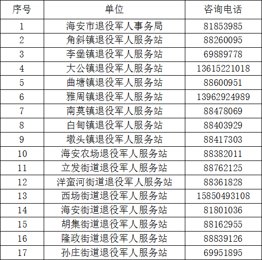 附【海安市退役军人事务局和各区镇退役军人服务站咨询电话】