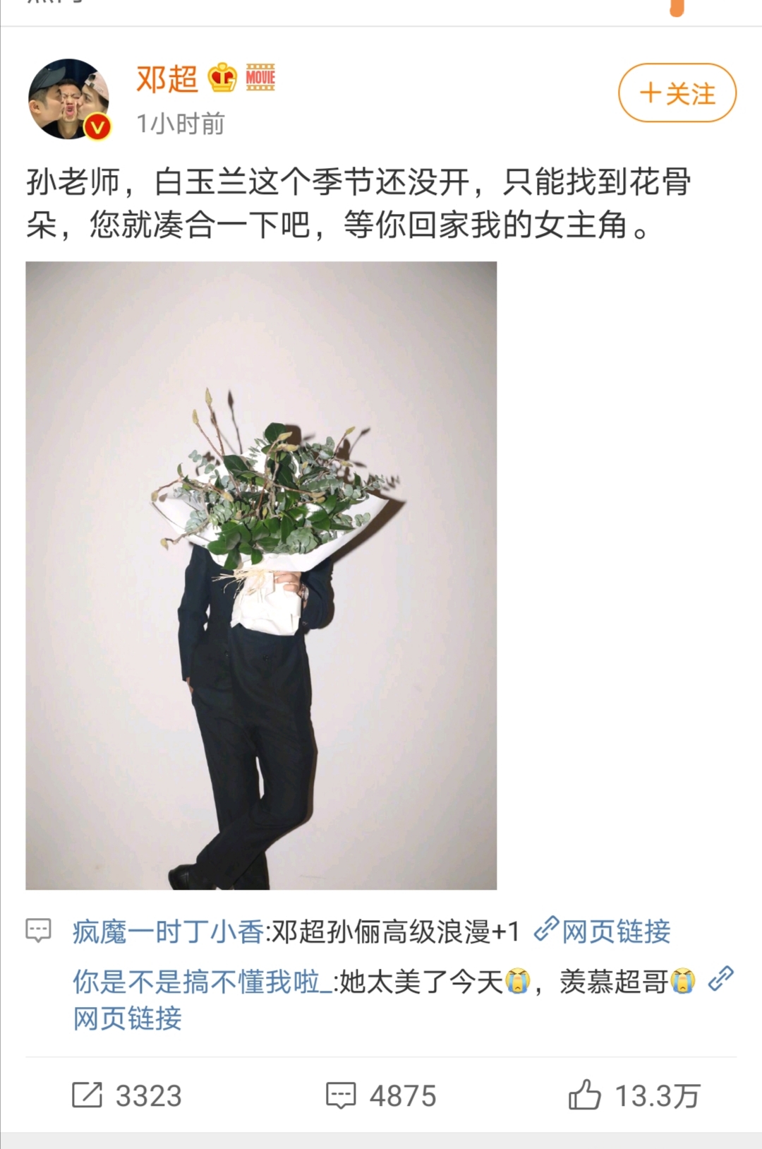老公邓超随后发文安慰:“孙老师,白玉兰这个季节还没开,只能找到花骨朵,您就凑合一下吧,等你回家我的女主角。”