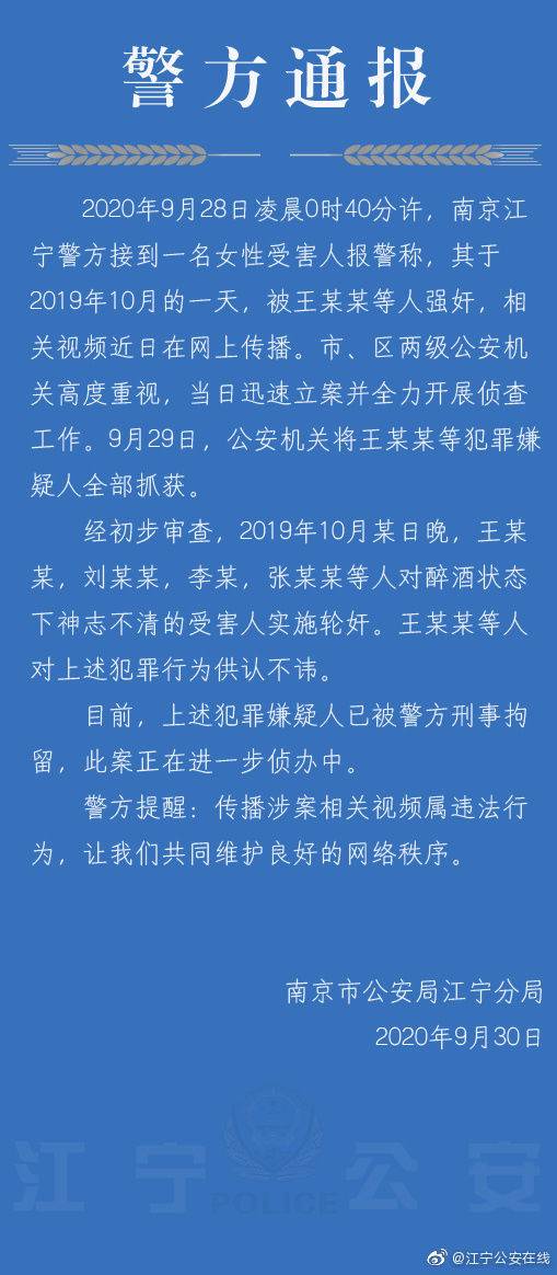 扬子晚报网9月30日讯(记者 梅建明)9月30日上午11点40分许,南京市公安局江宁分局通过“江宁公安在线”发布微博通报,称2020年9月28日凌晨0时40分许,南京江宁警方接到一名女性受害人报警称,其于2019年10月的一天,被王某某等人强奸,相关视频近日在网上传播。南京市及江宁区两级公安机关高度重视,当日迅速立案并全力开展侦查工作。9月29日,公安机关将王某某等犯罪嫌疑人全部抓获。