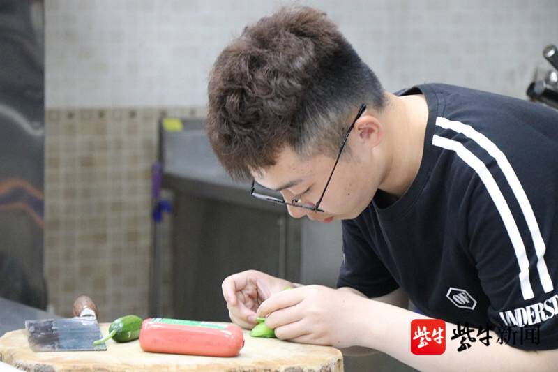 记者注意到,一件制作完成的冷拼上面,还摆放着“强军梦”三个字。“我高中的时候忙着练习刀工,现在上大学了,时间上更充沛,我想有机会就去当兵,为国出力。”邢阿强说。