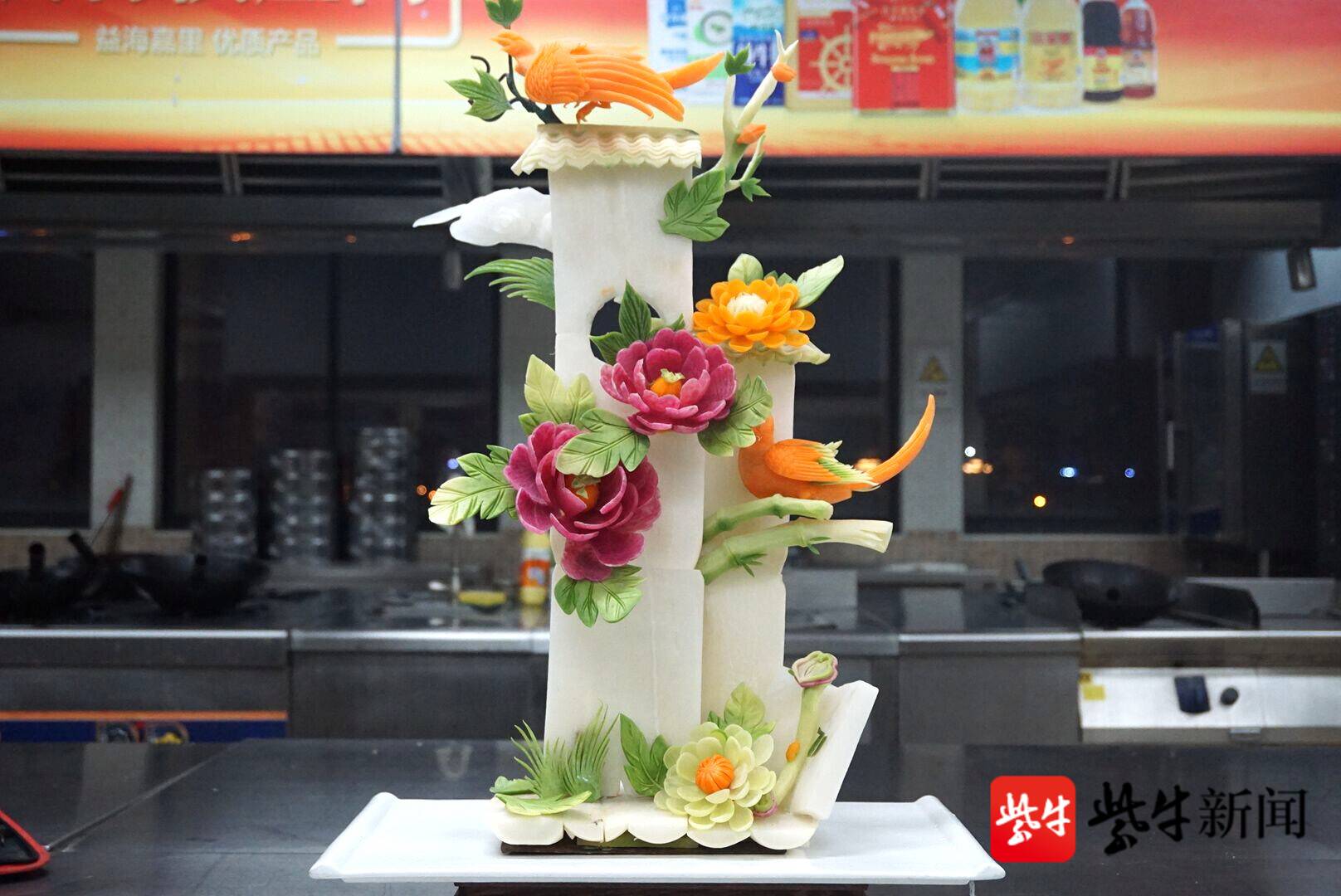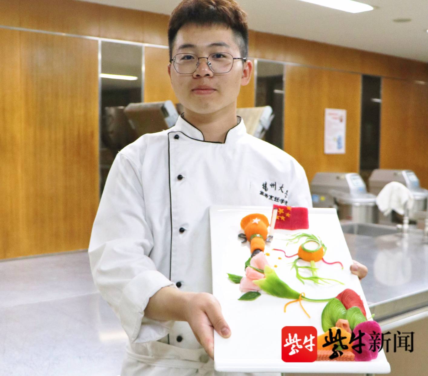“冷拼就是借助瓜果蔬菜,加工拼摆成心中想要的模样。”烹饪1905班的邢阿强说。记者采访时了解到,邢阿强是国家技能比赛金奖获得者。此次国庆,他想借助自己的特长为祖国庆生。