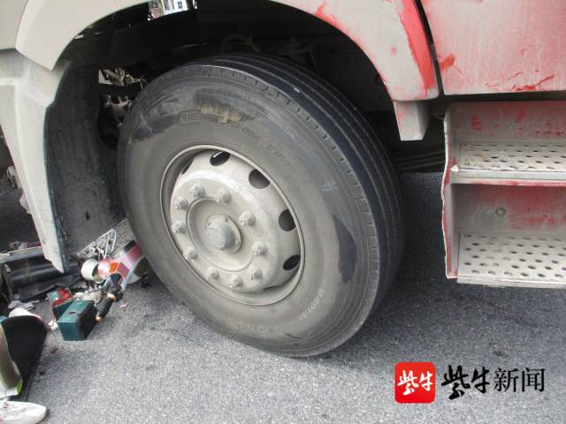 接到报警后,交警立即赶赴现场处置。经过现场勘查,许某驾驶的电动自行车倒在半挂车车头第一二排车轮中间,前轮折断、车身变形。车头置物篮已完全扭曲在一起,车上三块电瓶及一些零部件掉落在地上,上面还沾染少量血迹。