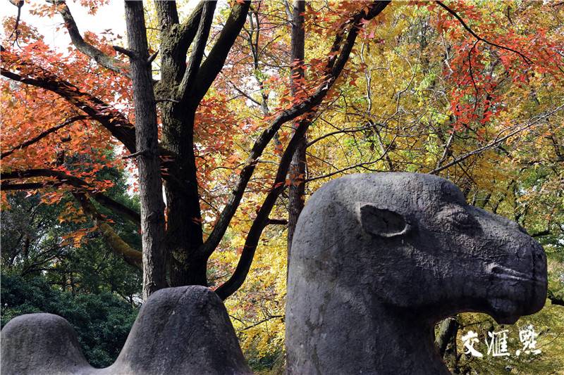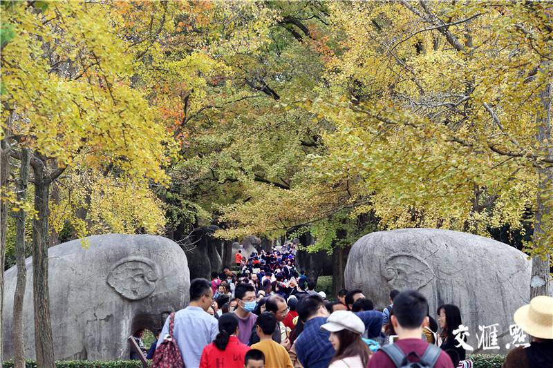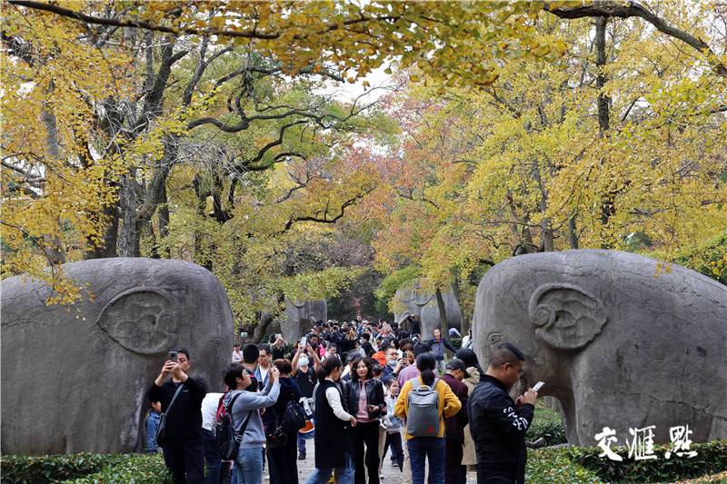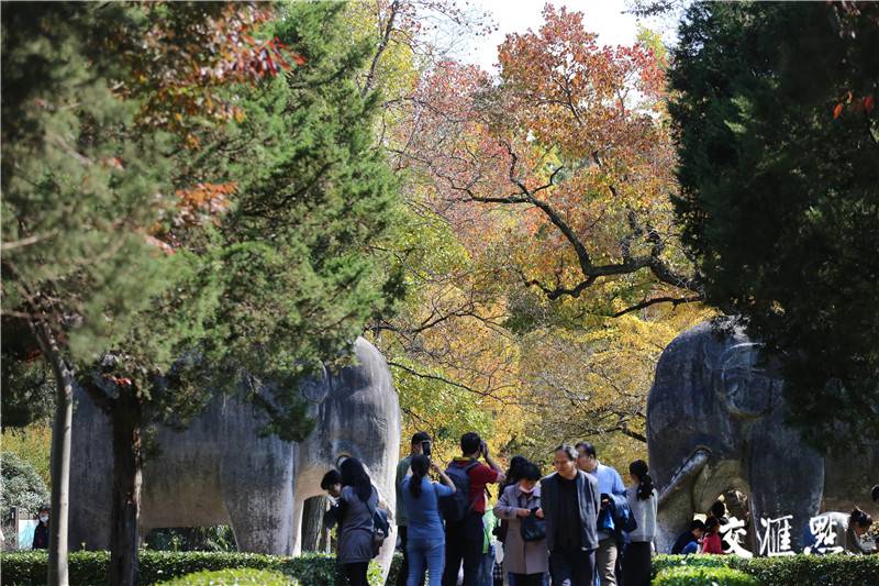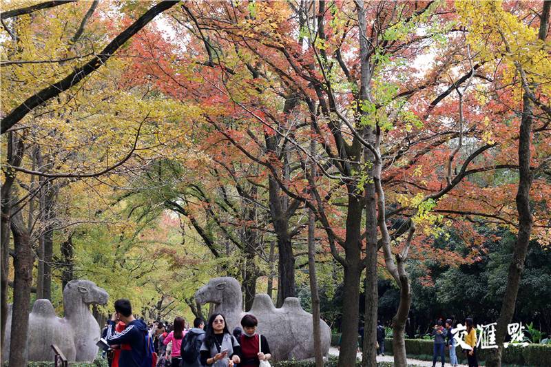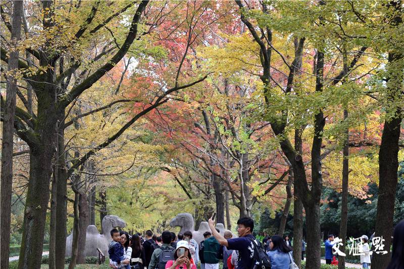 2020年10月31日,深秋的南京阳光明媚,钟山风景区的石象路也迎来最美时光。银杏、榉树等树木的红、棕、黄等各色交织,阳光下,在一尊尊高大的石像旁,五彩斑斓如油画般美不胜收。又是周末,如织的游人前来欣赏、拍摄。