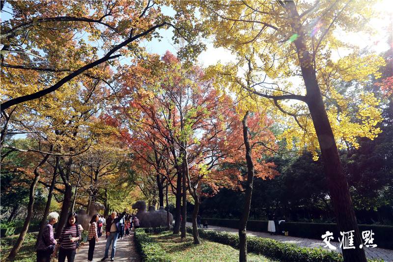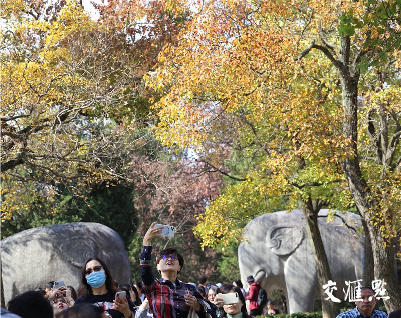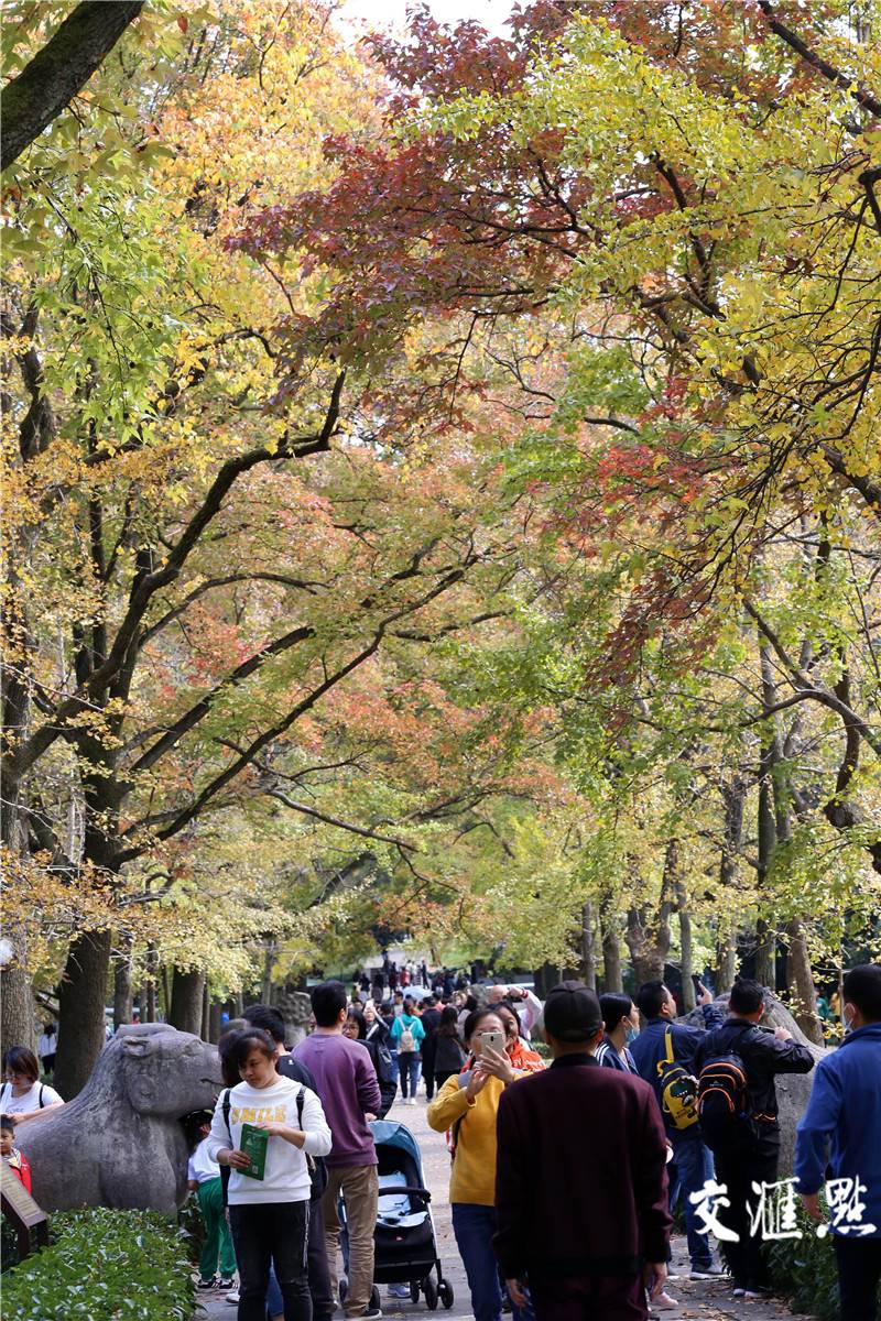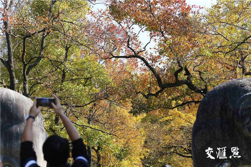 2020年10月31日,深秋的南京阳光明媚,钟山风景区的石象路也迎来最美时光。银杏、榉树等树木的红、棕、黄等各色交织,阳光下,在一尊尊高大的石像旁,五彩斑斓如油画般美不胜收。又是周末,如织的游人前来欣赏、拍摄。 交汇点记者 宋宁 摄